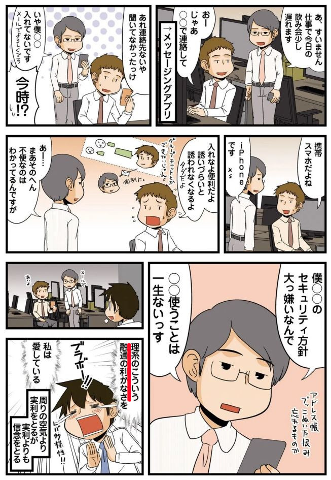 それで、「LINEをしない人」のしない理由というのが、人それぞれだとは思うけど、上のマンガのような