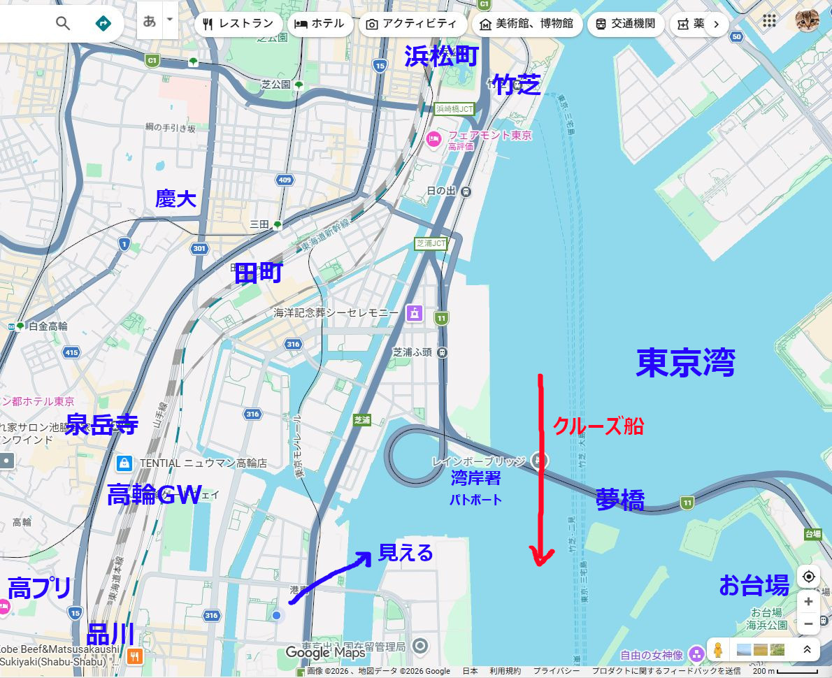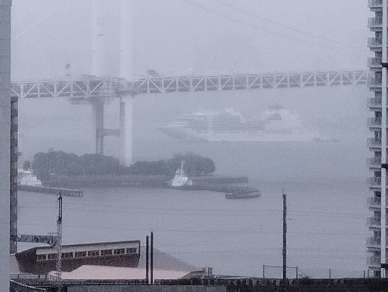 今朝起きてベランダに出たら、ちょうどクルーズ船が虹橋(レインボーブリッジ)をくぐって出て行くところでした