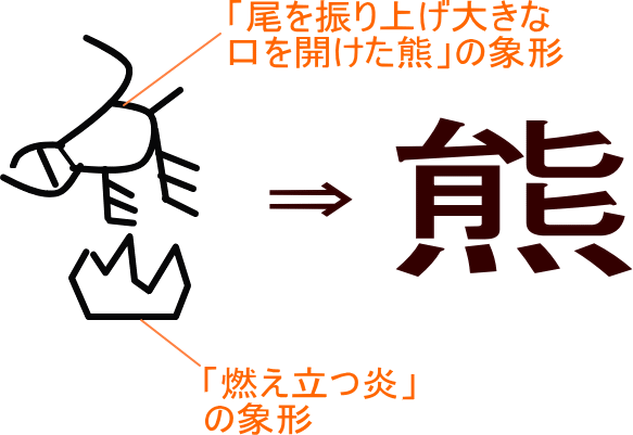 熊と言う字は、昔は下が4つ足と思っていましたが実は4足ではなく、火です。この字は、熊を捕らえて逆さまに吊って、下から火で焼くと言う象形文字です。獰猛な熊でなく、捕まって逆さまに吊されて焼かれる姿なので、少しかわいそうですね。