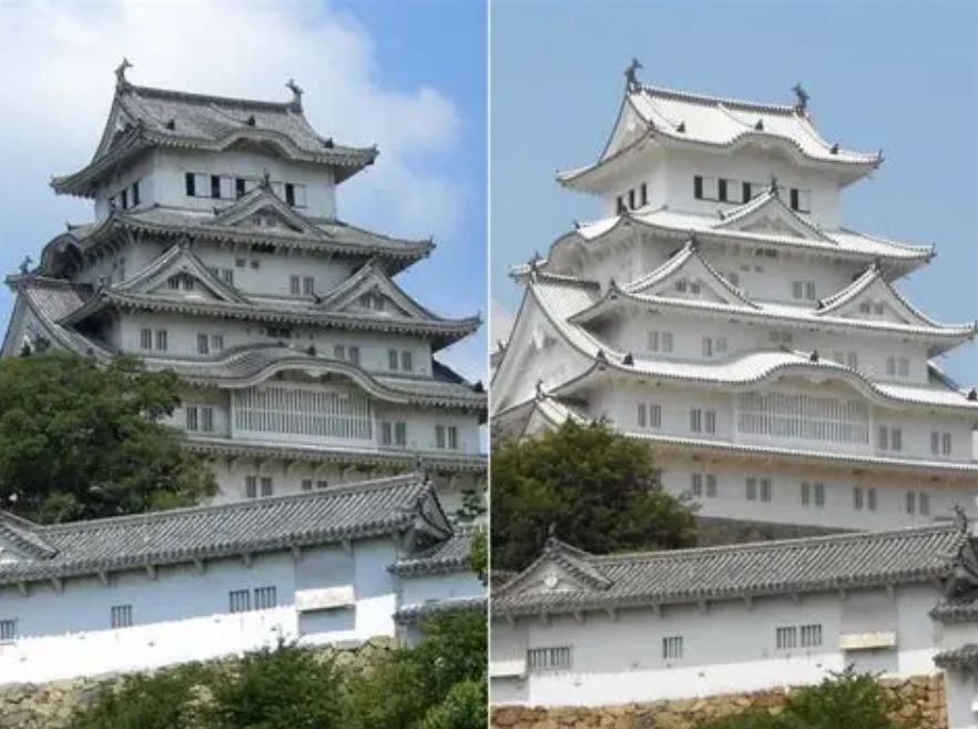 姫路城は、平成の大修理(2009~2015年)で色合いが白っぽくなりました