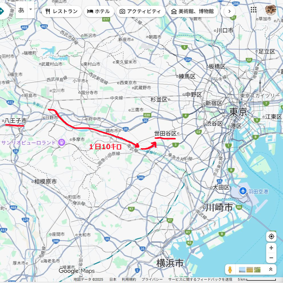障害物の少ない河川敷など走れば、1時間足らずで世田谷まで来れます